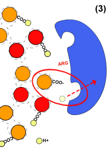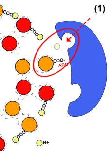 Das deprotonierte ASP 61 (-COO-) nimmt vorübergehend Kontakt mit dem positiv geladenen ARG 210 (-NH3+) auf, bevor es an der "Protonen-Annahmestelle" wieder mit einem neuen Proton aus dem Intermembranraum beladen wird.