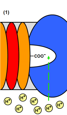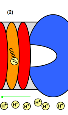 Dieses Proton wird durch einen "Protonenkanal", oder besser "Protonenpfad" (siehe unten), auf eine F0c-Untereinheit übertragen (1).