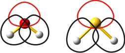 Die Ursache der Orbitalverzerrung wird deutlich, wenn alle Valenzorbitale der beiden Moleküle betrachtet werden. Dies ist im folgenden Schema dargestellt. Die Orbitale sind maßstabsgerecht dargestellt und alle gleichermaßen bei einem höheren Funktionswert konturiert als bei den bisherigen Darstellungen – sie wirken also kleiner (das freie p-Orbital ist nicht berücksichtigt; man mache sich klar, dass dessen Wechselwirkung mit den übrigen drei Valenzorbitalen nicht vom Bindungswinkel abhängt):