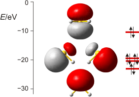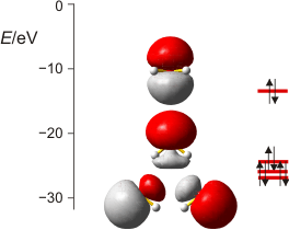Molekülorbitale beschreiben die elektronische Struktur eines Moleküls scheinbar auf völlig andere Weise. Oft umfasst ein MO alle Zentren des betrachteten Moleküls. So stellen die Orbitale ψ1, ψ2 und ψ3 im MO-Schema des H2S-Moleküls 2e-3z-Zustände dar. Nur ψ4 ist allein am S-Atom zentriert und entspricht einem der freien Elektronenpaare der Lewisformel.