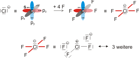 Die kovalente Bindungsordnung aller Cl-F-Bindungen ist hier ½. Auch hier bestätigt die Strukturanalyse die Vorhersage. Als mittlere Bindungslänge wird dabei 179 pm ermittelt, was einer deutlichen Aufweitung gegenüber einer 2e-2z-Bindung zwischen Chlor und Fluor entspricht.