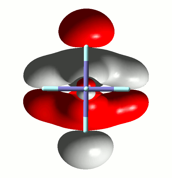 Wenn Sie die im Skript vorgestellten Rechnungen nachvollziehen und/oder weitergehend interpretieren wollen, achten Sie auf einen geläufigen Fallstrick. Er ist am Orbital 29a der Rechnung an Hexafluoridoferrat(III) dargestellt, das eine bindende Wechselwirkung zwischen einem Metall-4p und sechs Ligandbeiträgen darstellt – zwei vom σ- und vier vom π-Typ. Mit isovalue = 0.06 ergibt sich folgendes Bild: