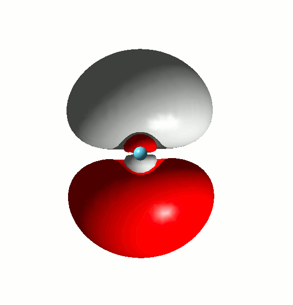 Vergleichen Sie nun mit den Abbildungen von s- und p-Orbitalen höherer Schalen, wie Sie sie in den Lehrbüchern finden können: Es gibt Knotenebenen im Inneren eines Atomorbitals! Ein Beispiel ist ein p-Orbital aus der Valenzschale eines Kryptonatoms, also wie beim Eisenkomplex ein 4p-Orbital (isovalue = 0.02):