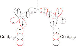 Man beachte bei der Aufstellung solcher Schemata eine gewisse Willkür beim Einzeichnen der Orbitale. So lassen sich die jeweils zwei O-py- und O-pz-Orbitale so linearkombinieren, dass das abgebildete „Kleeblatt“ an O um einen beliebigen Winkel in der Zeichenebene gedreht ist. Die Spinkopplung zu C kann daher durch ein einziges O-p-Orbital dargestellt werden, das in einer möglichst günstigen Position für eine Überlappung mit dem Cu-d- und dem C-p-Orbital liegt. Das im Hauptext dünn gestrichelte zweite Orbital vermittelt dann lediglich einen nichtbindenden Wechselwirkungspfad zwischen Cu und C und trägt nicht nennenswert zur Spinkopplung bei.