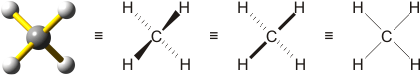 Allgemeine und Anorganische Chemie (AC1) Die meisten der vierfach koordinierten Moleküle in dieser Vorlesung haben Tetraedergestalt. Dabei bilden die vier Substituenten die Ecken eines Tetraeders, dessen Schwerpunkt vom Zentralatom belegt ist. Um dies darzustellen, werden die vier Substituenten in der Form eines Quadrats um das Zentralatom herum gezeichnet, so wie dies in der rechten Formel gezeigt ist. Eine ausdrückliche Betonung der Tetraedergestalt wie in der zweiten Formel von links (Keile laufen auf den Betrachter zu, gestrichelte Bindungen weisen nach hinten) bedeutet dasselbe, ebenso eine weitere verbreitete Schreibweise, bei der die Keile zu einer fett gezeichneten Bindung vereinfacht sind. Wenn Sie schon mit der Symmetrielehre vertraut sind: die Darstellung entspricht der Projektion entlang einer der S4-Achsen eines Tetraeders:
