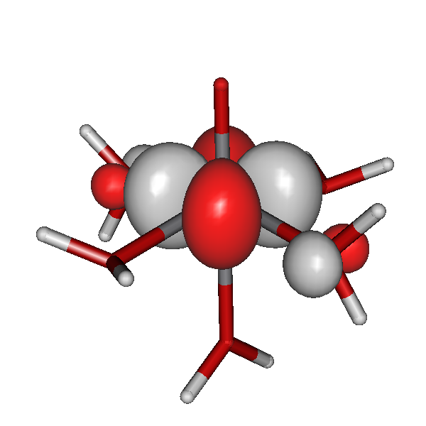 Das folgende Bild zeigt ein solches [Al13O4(OH)24(H2O)12]7+-Ion. Da die Lagen der Wasserstoffatome nicht experimentell bestimmt wurde, ergibt sich die Zuordnung von Sauerstoffatomen zu Aqua-, Hydroxido- oder Oxido-Liganden nur aus der Ladungsbilanz (eben so, dass 7+ herauskommt). Die Oxido-Liganden sind die vier Liganden, die in der Mitte des Kations das tetraedrisch umgebene Al-Atom koordinieren. Diese vier Oxido-Liganden sind ebenfalls tetraedrisch von Aluminium-Zentralatomen umgeben – sie sind vierfach verbrückend. Dies kann man auch in der Formel ausdrücken: [Al13(μ4-O)4(μ2-OH)24(H2O)12]7+. Statt μ2 genügt auch ein einfaches μ: [Al13(μ4-O)4(μ-OH)24(H2O)12]7+.