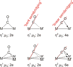 Die Bindung von Carbonylliganden als terminale oder verbrückende Liganden ändert in der Regel nichts an der Elektronenbilanz. Ist ein verbrückender Carbonylligand nur über das C-Atom an zwei oder drei Metallatome gebunden, steht für die Hinbindung wie beim terminalen Bindungsmodus das freie Elektronenpaar am Kohlenstoffatom zur Verfügung. CO ist ein 2-Elektronen-Donor. Die üblichen Bindungsmodi verbrückender CO-Liganden sind im folgenden Schema zusammengestellt (pdf).