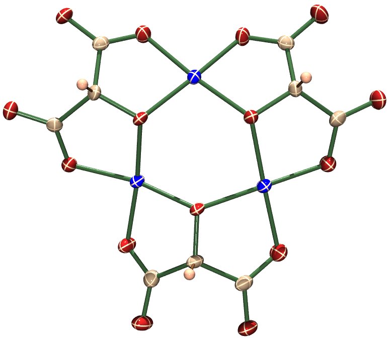 Nachdem die thermodynamischen Randbedingungen geklärt sind, lautet die nächste Frage, ob besondere Eigenschaften für das dreikernige Cuprat(II) zu erwarten sind. Die Strukturdaten zeigen günstige Voraussetzungen für Superausstausch an. Die bei Kupfer(II)-Komplexen sehr häufige antiferromagnetische Kopplung sollte bei dem betrachteten Tricuprat zu „Spinfrustration“ führen. die Winkel an O zeigen allerdings (wie fast immer) eine Aufhebung der C3-Symmetrie an (Cu-O-Cu-Winkel vom rechten oberen Brücken-O-Atom im Uhrzeigersinn: 130, 129, 115°). Die Spinkopplung kann über längere Strecken vermittelt werden. Ein Lehrbuchbeispiel ist Kupfer(II)-acetat, bei dem sich die Frage stellt, ob nicht eine Kupfer-Kupfer-Bindung die bessere Erklärung für den beobachteten S=0-Grundzustand ist.