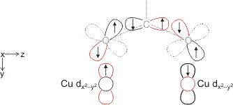 Eine Betrachtung des Kristallfeldschemas für ein quadratisch-planares CuO4-Fragment zeigt, dass das spintragende Orbital das x2−y2-Orbital ist. Die in Frage kommende Einfachbindung wäre also eine δ-Bindung. Die Art der Spinkopplung entspricht dagegen nicht ganz der Erwartung. Zwar ist im Grundzustand S = 0, allerdings lässt sich der Grundzustand nur bei tiefer Temperatur untersuchen; bei Raumtemperatur sind die beiden Spins merklich entkoppelt. Im Bereich teilweiser Spinkopplung zwischen ca. −200 und −100 °C beschreibt der Formalismus der antiferromagnetischen Kopplung korrekt den Verlauf der zunehmenden Entkopplung. Die Struktur von Kupferacetat lässt die Interpretation durchaus zu, den S=0-Grundzustand als Folge antiferromagnetischer Kopplung zu verstehen. Die magnetischen x2−y2-Orbitale sind auf die O-Atome der verbrückenden Acetato-Liganden ausgerichtet und es ergibt sich ein antiferromagnetischer Austauschpfad im Sinne der Goodenough-Kanamori-Regeln, der im folgenden Bild für einen der vier Acetato-Liganden formuliert ist. Die übrigen drei Liganden lassen sich auf die gleiche Weise behandeln, so dass durch das Zusammenwirkung der vier Austauschpfade die hohe Kopplungskonstante von J = −294 cm−1 plausibel wird. (Die x-Richtung ist in der folgenden Abbildung senkrecht zur Zeichenebene gewählt, z verläuft entlang der Cu-Cu-Achse; man beachte, dass die px-Orbitale an den O-Atomen nichtbindende Wechselwirkungen mit den x2−y2-Orbitalen der Kupferatome aufweisen, dass also nicht die delokalisierte π-Bindung des Carboxylato-Liganden für die antiferromagnetische Kopplung verantwortlich ist; die üblicherweise formulierte sp2-Hybridisierung am Carboxylat-C-Atom wurde für das Kopplungsschema aufgehoben, ferner wurden die py- und pz-Orbitale der O-Atome in geeigneter Weise linearkombiniert.)