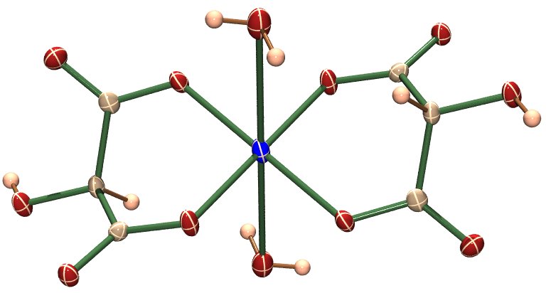 Konkret schauen wir folgendes Beispiel an: Wir vereinfachen Tartrat zu Tartronat (das ist das Anion der 2-Hydroxy-1,3-propandisäure, also Hydroxymalonat, wenn Sie so wollen) und setzen mindestens die doppeltmolare Menge dieses „ambidenten“ Liganden in wässrig-neutraler Lösung mit Kupfer(II)-Salzen um. Es lassen sich dann Salze wie zum Beispiel Li2[Cu(C3H2O5)2(H2O)2] · 2 H2O isolieren. Die Struktur der Diaqua-bis(tartronato-O1,O3)-cuprat(II)-Dianionen ist nicht ungewöhnlich: über die Carboxylatfunktionen der Tartronat-Liganden sind sechsgliedrige Chelatringe gebildet worden. Die Cu-O-Abstände betragen ca. 195 pm (1.95 Å). Mit 291 pm deutlich weiter entfernt sind zwei O-Atome von Aqualiganden. Das Tartronatocuprat zeigt damit die zu erwartende Jahn-Teller-Verzerrung in ungewöhnlich deutlicher Form. Die Ursache hierfür wird weiter unten behandelt.