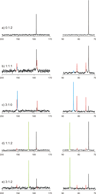 Auch als pdf verfügbar (rechts anklicken und entscheiden, was man will): 13C-NMR Spektren in D2O bei verschiedenen molaren Verhältnissen [(R,R-chxn)Pd(OH)2]:l-H2tart:OH− von 1:1:1, 3:1:0, 1:1:2 und 3:1:2. Die auf der Abszisse angegebene chemische Verschiebung bezieht sich auf TMS (δ = 0 ppm). Spektrum a: Dinatrium-l-tartrat in D2O; Komplexspezies sind farbig dargestellt.