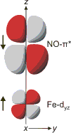 Es wird deutlich, dass sowohl Triplett-NO− als auch, in alternativer Betrachtung, das NO-Radikal linear an das Eisenzentrum binden. Aus der DFT-Rechnung in [brown_ring1] folgt ein Energieschema für die Grenzorbitale des Komplexes (Abbildungen auch als pdf). Dargestellt sind diejenigen Orbitale, die im Bereich des FeNO-Fragments lokalisiert sind. Die Nummern verweisen auf Tabelle 8 in [brown_ring1], außerdem sind die beteiligten Fe-Orbitale genannt; man beachte aber, dass hiermit ein Elektron nicht allein dem jeweiligen Orbital zugewiesen wird; die beiden besetzten β-Spin-Orbitale haben zum Beispiel jeweils zur Hälfte Metall- und NO-π*-Charakter. Die braune Farbe von [Fe(H2O)5NO]2+ geht auf Übergänge des Typs π→σ* zurück: