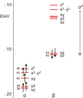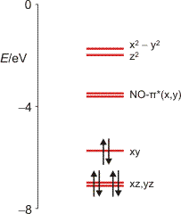 Den in der Abbildung gezeigten Fällen ist gemeinsam, dass HOMO und LUMO metallständige Orbitale sind. Die elektronische Anregung mit der niedrigsten Energie wird daher ein Übergang zwischen den d-Orbitalen des Metalls sein. Die besonderen Eigenschaften einiger Nitrosylkomplexe, nach Bestrahlung langlebige metastabile Zustände unter Rotation des Nitrosylliganden zu entwickeln, wird so nicht plausibel. Rechnungen am Nitroprussid-Anion zeigen jedoch, dass durch die Substitution eines von sechs Cyano-Liganden eines Hexacyanoferrat(II)-Ions durch NO+ ein antibindendes NO-π*-Orbital unter den eg*-Zustand eingeschoben ist (P. Boulet, M. Buchs, H. Chermette, C. Daul, F. Gilardoni, F. Rogemond, C. W. Schläpfer, J. Weber, J. Phys. Chem. A 2001, 105, 8991–8998; die Orbitalenergien sind für ein Anion unerwartet niedrig, die Autoren geben aber keine Einzelheiten an, vermutlich haben sie ein isotropes positives Feld zugeschaltet):