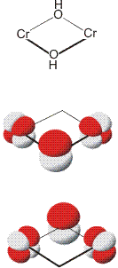 Der Frage „Bindung oder antiferromagnetische Kopplung?“ kann man sich besonders gut nähern, wenn Spezies in die Diskussion eingeschlossen werden, bei denen üblicherweise eine Bindung überhaupt nicht diskutiert wird. Ein Beispiel sind mehrkernige, oxido-verbrückte Chrom(III)-Spezies. Im folgenden soll ein Kation, in dem zwei Chrom-Atome in einem Abstand von ca. 3 Å vorliegen, auf mögliche Austauschpfade untersucht werden, um abschließend die Frage nach einer Cr-Cr-Bindung zu klären. Aufgrund der kinetischen Inertheit von Chrom(III)-Zentren gegenüber Ligandenaustauschreaktionen können hier Zwischenstufen auf dem Weg [Cr(H2O)6]3+ → Cr(OH)3 isoliert werden, die bei einem Zentralmetall wie Eisen oder Aluminium bislang nicht gefasst wurden. Ein Beispiel ist das [Cr2(OH)2(H2O)8]4+-Ion, für das eine Strukturanalyse vorliegt (Abb. auch als pdf):