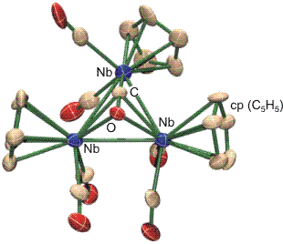 Die rechts gezeichneten Fälle des linear halbverbrückenden Modus, bei dem auch M = M' sein kann, sind selten. Sie haben besondere elektronische Verhältnisse zur Voraussetzung. Ein Beispiel für den η2, μ3-6e-Fall liegt im dreikernigen Komplex [Nb3(cp)3(CO)7] vor (Hermann, 1981). Hier ist M = M' = Nb(cp)(CO)2. Der die Bildung eines Clusters verursachende Ligandmangel wurde durch CO-Abspaltung aus dem einkernigen Carbonylkomplex [Nb(cp)(CO)4] durch Bestrahlen mit UV-Licht herbeigeführt. Ein cyclischer [{Nb(cp)(CO)n}m]-Cluster mit zwei Niob-Niob-Einfachbindungen pro Metallatom darf für n = 3 erwartet werden (siehe unten). Ein dreikerniger Cluster (m = 3) hätte dann die Zusammensetzung [Nb3(cp)3(CO)9] – was wohl zu einer sterischen Überladung führen würde. Der gefundene Cluster enthält zwei Carbonyl-Liganden weniger und trotzdem vermittelt die Struktur den Eindruck eines beachtlichen „Gedränges“: jedes Niob-Atom ist von zwei terminalen Carbonyl-Liganden koordiniert; der Cyclopentadienyl-Ligand ist wie üblich η5 gebunden. Man beachte, dass im Bild an jedem Cyclopentadienyl-Liganden der Übersichtlichkeit halber 5 H-Atome nicht eingezeichnet sind, die aber natürlich auch noch Platz brauchen.