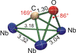Die weiter unten zusammengefassten Elektronenabzählregeln zeigen, dass dem Cluster wegen des Verzichts auf zwei CO-Liganden vier Elektronen zur Erfüllung der 18-Elektronenregel fehlen – wenn alle CO-Liganden als 2-Elektronendonoren gezählt werden. Dass die 18-Elektronen-Regel einen hohen Stellenwert hat, wird bei einem genaueren Blick auf den μ3-CO-Liganden deutlich, der eine Reihe von Besonderheiten aufweist. Üblicherweise ist das Sauerstoffatom eines verbrückenden Carbonyl-Liganden von den Metallatomen weggeneigt (siehe oben im Schema). Aus dem im folgenden Bild dargestellten Ausschnitt aus der Struktur des Niobclusters geht jedoch hervor, dass das Fe-C-O-Fragment nicht nur entsprechend der Einstufung “linear semibridging” mit einem Winkel von 169° am C-Atom nur wenig geknickt ist, sondern das vielmehr die geringe Abwinklung darauf zurückzuführen ist, dass das O-Atom sich zwei Nb-Atomen zuneigt. Der Nb-O-Nb-Winkel von 86° (Nb-C-Nb 85°) liegt nahe am rechten Winkel – so wie man es für zwei Donorbindungen erwarten darf, die von den senkrecht aufeinander stehenden bindenden π-Orbitalen zwischen C und O ausgehen. Die C-O-Bindung wird durch diese neuen Bindungen zu zwei Niob-Atomen merklich geschwächt. Der C-O-Abstand ist mit 1.30 Å gegenüber freiem CO (1.13 Å) deutlich aufgeweitet; man vergleiche den oben angegebenen Wert von 1.15 Å im [Fe(CO)3NO]−-Ion, 1.20 Å einer C=O-Doppelbindung und 1.43 Å einer C–O-Einfachbindung. Die deutlich herabgesetzte Bindungsordnung führt zu einem für Carbonylkomplexe ungewöhnlich niedrigen Wert für die Energie der C-O-Streckschwingung von nur 1330 cm−1. Vor allem dieser letzte Wert passt zu der Interpretation, dass der verbrückende Carbonylligand als 6-Elektronen-Donor fungiert. Es ist jedoch zu beachten, dass eine 18-Elektronenbilanz auch durch 1 Nb=Nb-Doppelbindung erreicht würde. Die im Bild angegebenen Nb-Nb-Abstände zeigen, dass die Metall-Metall-Abstände tatsächlich nicht alle gleich groß sind. Da keine neueren Rechnungen an diesem Cluster vorliegen, bleibt hier Deutungsspielraum.