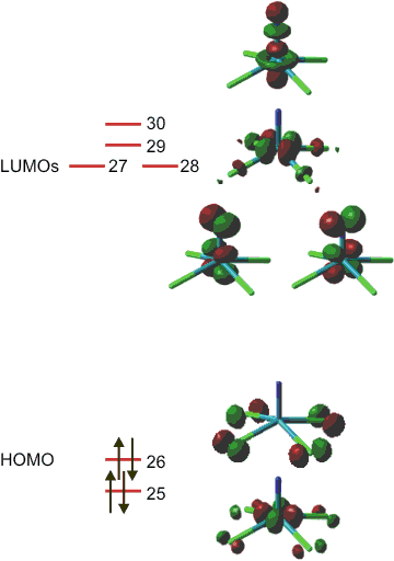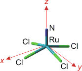 Bei der Diskussion der Mo-Mo-Einfachbindung führt das Kristallfeldmodell zu einer plausiblen Deutung der Bindung als einer Wechselwirkung mit lokaler σ-Symmetrie. Sind die Liganden sehr verschieden oder ist die Geometrie des Komplexes ungewöhnlicher, fällt es schwerer, die metallständigen Orbitale hinsichtlich ihrer energetischen Abfolgee zu ordnen. Ein Beispiel ist das [RuVINCl4]−-Ion, ein d2-Komplex, der aus RuO4, HCl und Azid zugänglich ist. Die Strukturanalyse zeigt quadratisch-pyramidalen Aufbau. Der Ru-N-Abstand ist mit 1.58 Å recht kurz; die Ru-Cl-Abstände betragen im Mittel 2.31 Å, der mittlere N-Ru-Cl-Winkel ist mit 105° stumpf. Ein erstes und schnell zugängliches Bild über die Grenzorbitale vermittelt eine DFT-Rechnung mit kleinem Basissatz (vgl. eine Gaussian-Eingabedatei; wenn Sie die Rechnung nachvollziehen wollen, ändern Sie die Datei-Extension in „gjf“). Die Koordinaten für die Rechnung sind wie folgt gewählt:
