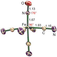 Sowohl [Fe(CO)5] als auch [Fe(CO)3NO]− sind typische Komplexe mit stark π-aciden Liganden, die der 18-e-Regel genügen. Um die Elektronenbilanz festzustellen, wird üblicherweise (1) aus der Ladung des Komplexes und der (von der IUPAC festgesetzten) Ladung der Liganden die Oxidationsstufe des Zentralmetallatoms bestimmt, dann (2) die Zahl der (n−1)d-Elektronen des Metalls ermittelt (der ns-Zustand wird dabei als unbesetzt angenommen) und (3) diese d-Elektronenzahl und die Zahl der (laut IUPAC-Regel) von den Liganden beigetragenen Elektronen addiert. Für [Fe(CO)5] ergibt sich wegen des Neutralliganden CO 0 als Oxidationsstufe des Eisens entsprechend 8 3d-Elektronen, hinzugezählt werden 5 × 2 = 10 Elektronen, da CO als 2e-Donor zählt, so dass sich insgesamt 18 e ergeben. Diese Zählweise steht im Einklang mit den physikalischen Eigenschaften des Pentacarbonyleisens – formale und physikalische (spektroskopische) Oxidationsstufe sind gleich. Dies ist bei Nitrosylkomplexen eher die Ausnahme. Der Nitrosylligand ist als neutraler Dreielektronen-Donor definiert. Für das [Fe(CO)3NO]−-Ion ergibt die Rechnung dann −I als Oxidationsstufe des Zentralmetalls entsprechend 9 d-Elektronen. Hinzuaddiert werden 3 × 2 = 6 Elektronen von den drei Carbonyl-Liganden und 3 Elektronen von NO. Die Summe ist wieder 18 Elektronen. Die Behandlung von NO als Neutralligand führt jedoch zu einer Reihe von Problemen bei der Deutung der physikalischen Daten. So zeigt die Strukturanalyse eine lineare Fe-N-O-Einheit, während das VSEPR-Modell eine an N gewinkelte Struktur nahelegt. Werden Abstände (in der Abbildung in Å, die Zahlenwerte sind Mittelwerte im Natriumsalz) und Winkel hinzugenommen, so ergibt sich eher die Vorstellung von einem mit CO isosteren NO+-Ligand, der den Carbonyl-Liganden hinsichtlich der π-Acidität deutlich übertrifft (Abbildung als pdf):