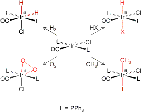 angemessen beschrieben wird (die letzten drei Formeln als pdf). Ist das Gegenion des Elektrophils ein besserer Ligand als das Tetrafluoridoborat-Ion, so ergänzt dieses die Koordinationsspäre des Iridiums. Dies gilt auch für die Abgangsgruppe bei der Reaktion von Vaskas Komplex mit polaren Substraten wie den Halogenwasserstoffen oder Iodmethan (im folgenden Schema rechts; pdf):