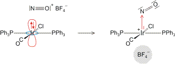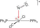 Man beachte, dass bei üblicher Zählweise das bindende Elektronenpaar zwischen Ir und N dem elektronegativeren Stickstoff zuzuweisen wäre, dass also ein NO−-Ligand vorliegt – NO+ ist oxidativ addiert worden. Die Anbindung ist nicht linear wie in dem besonderen Fall des [Fe(H2O)NO]2+-Ions, bei dem ein Triplett-NO− diskutiert wurde. Die hier vorliegende gewinkelte Ir-N-O-Gruppe (124° im Tetrafluoridoborat des abgebildeten Ions; in dessen Kristallstruktur liegt das Anion in räumlicher Nähe zum Komplexkation vor, so wie dies im Schema angedeutet ist) entspricht vielmehr dem häufiger beobachteten Fall eines Singulett-NO−-Liganden, der durch eine Lewis-Formel der Art