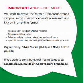 Durch unseren Umzug werden zukünftig auch Symposien in München stattfinden, doch dieses Jahr findet das Symposium erst einmal online statt (Zoom). Über drei Tage gibt es je drei Stunden spannende Vorträge, Diskussionen und Netzwerken über die aktuellen Trends in der Chemiedidaktik Forschung.