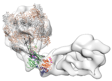 “In order to get a clearer picture of the structure, we took advantage of a method which was originally developed in Professor Ruedi Aebersold’s laboratory at the ETH in Zürich, and was established in our group at the Gene Center by Franz Herzog,” says Hopfner. The method employs a bifunctional reagent that reacts with chemical groups that are a certain distance apart, thus linking proteins that are close together in the complex. The use of a mixture of isotopically labeled versions of the chemical permits the subsequent identification of the cross-linked sites by mass spectrometry. Based on the resulting patterns, a protein-protein interaction map can be assembled that reveals aspects of the topology of the complex. “With this method, one can – within limits – deduce where in the complex each subunit lies,” as Alessandro Tosi and Franz Herzog, also joint first authors of the new report, point out.