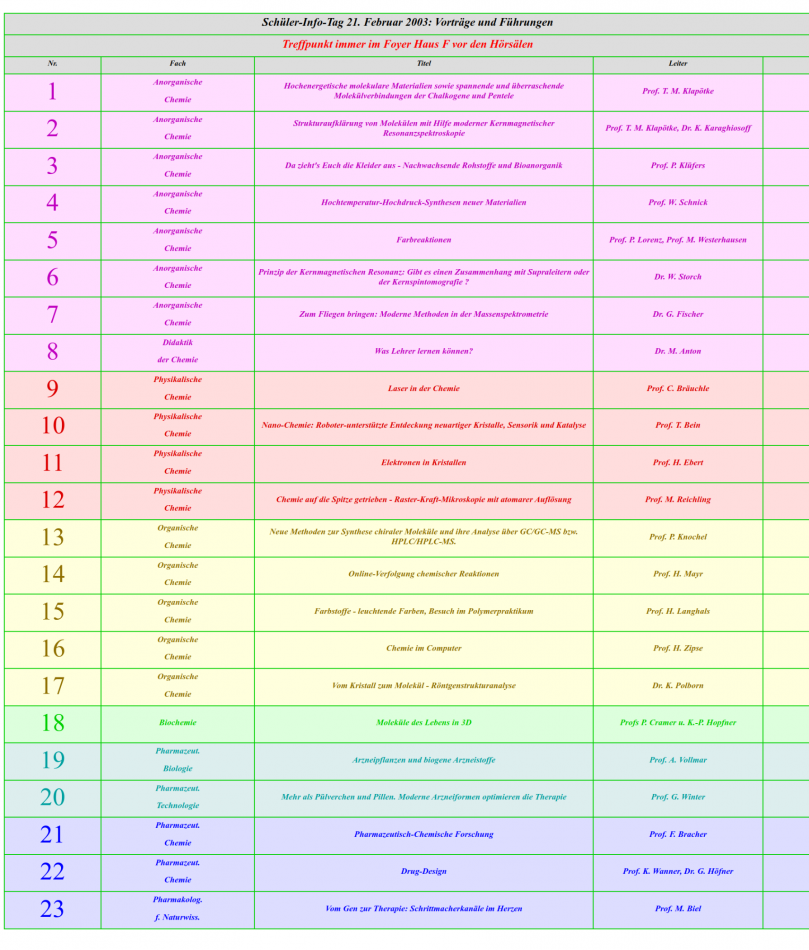 12.00 Uhr Vorstellung der Studiengänge Chemie und Pharmazie, Prof. Manfred Heuschmann, Dr. Michael Haas