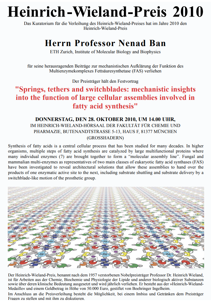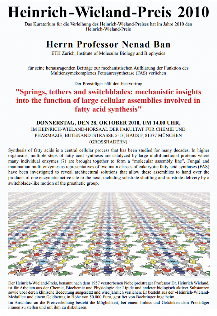 Das Kuratorium für die Verleihung des Heinrich-Wieland-Preises hat im Jahre 2010 den Heinrich-Wieland-Preis an Herrn Prof. Nenad Ban, ETH Zürich, Institut für Molecularbiologie and Biophysik, für seine herausragenden Beiträge zur mechanistischen Aufklärung der Funktion des Multienzymekomplexes Fettsäuresynthetase (FAS) verliehen.
