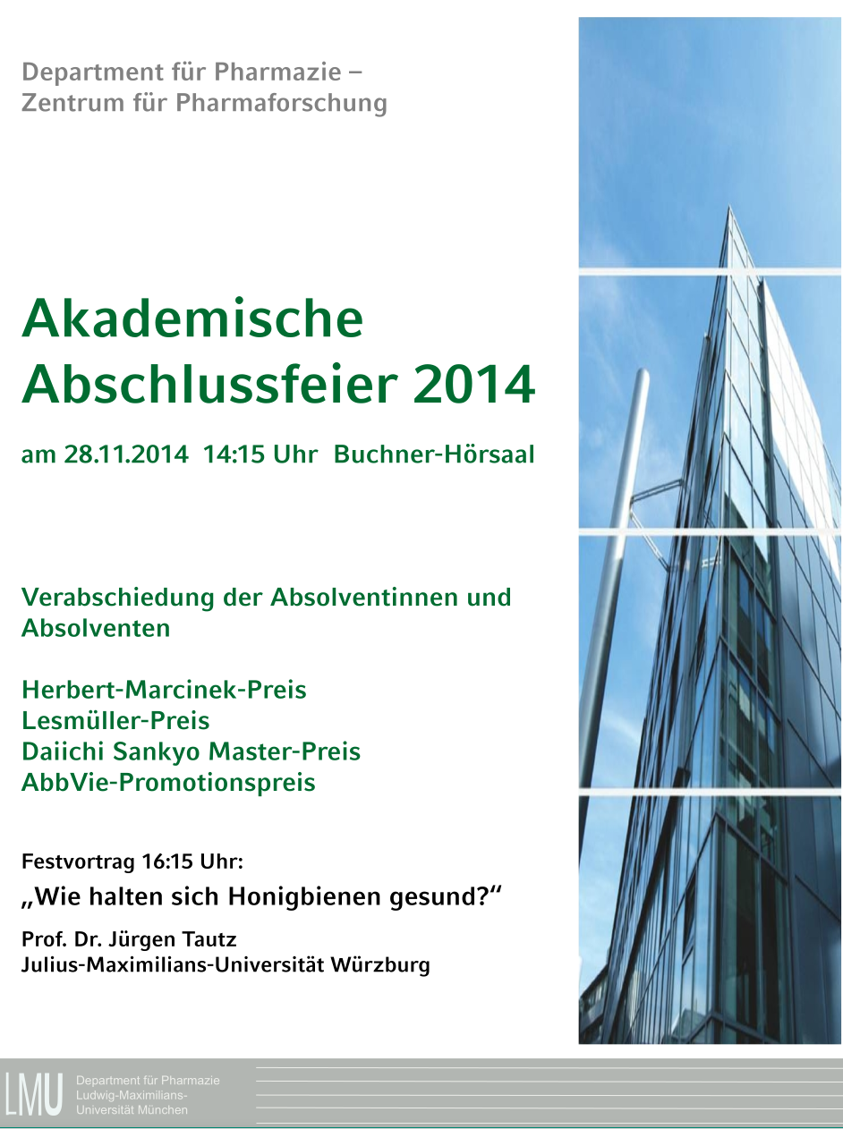 Im Rahmen der akademischen Abschlussfeier des Departments für Pharmazie zur Verabschiedung der Bachelor-, Master- und Staatsexamensstudierenden am 28.11.2014 findet die Verleihung des Herbert-Marcinek-Preises, des Daiichi Sankyo Master-Preises, des AbbVie-Promotionspreises und des Lesmüller-Preises der Dr. August und Dr. Anni Lesmüller-Stiftung statt.