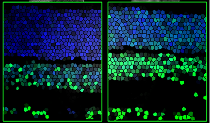 Querschnitt durch die Netzhaut. Die Menge des DNA-Bausteins 5hmC (grün) erhöht sich von Woche 2 (links) auf Woche 3 (rechts).