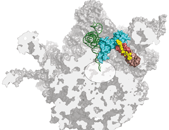 Evernimicin and avilamycin (yellow) bind to the ribosome at a previously unknown site for antibiotics and inhibit protein synthesis by sterically blocking the binding of tRNA in the active site of the ribosome.Image: S. Arenz