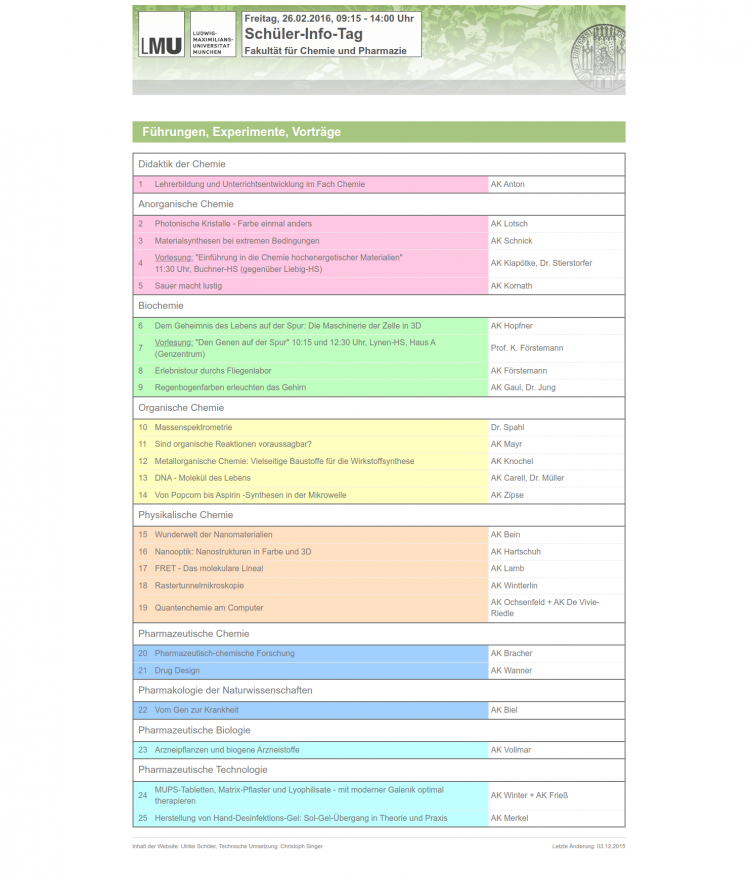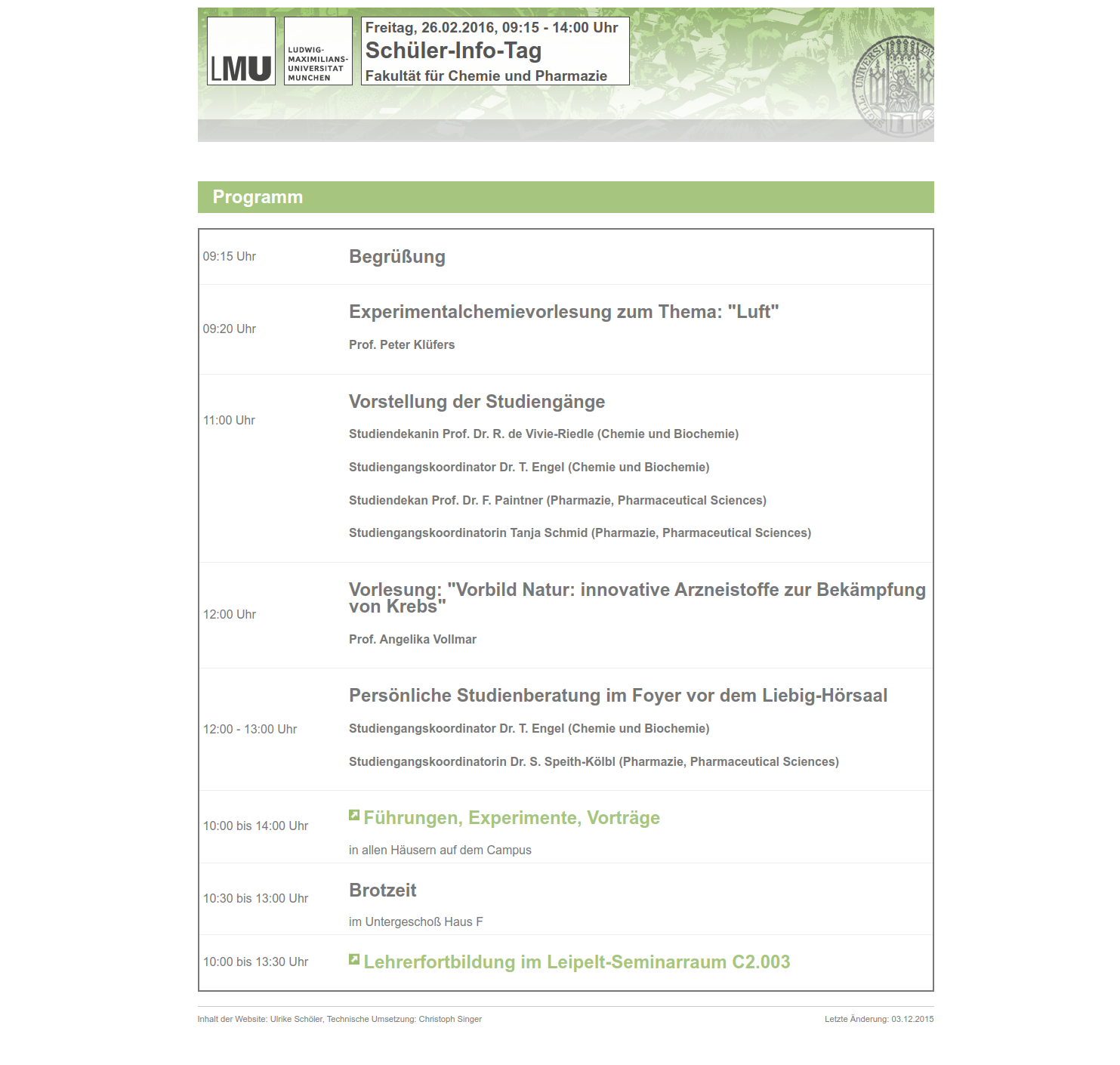 Am Freitag, den 26.02.2016 findet ein Schüler-Info-Tag für alle an Chemie oder Pharmazie interessierten Schüler statt. Highlights sind die große Chemievorlesung sowie Führungen, Experimente und Vorträge für Schüler auf dem gesamten Campus. Die Studiengangskoordinatoren stellen die Studiengänge der Fakultät vor.
