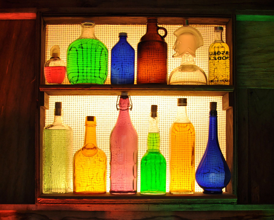 Im Inneren des Verschlages: Eine Batterie von Flaschen mit verschiedenfarbigen Lösungen in Mike Kelleys „The Keep“: Foto: Helena Ernst // © VG Bild-Kunst, Bonn 2017