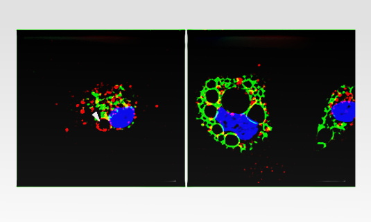 Mikroskopische Aufnahme von Immunzellen der Maus. Frühe Endosomen sind rot gefärbt, späte Endosomen und Lysosomen grün. Das Molekül YM201636 vergrößert selektiv späte Endosomen und Lysosomen (rechts), während eine Kombination zweier Biotoxine selektiv nur die frühen Endosomen vergrößert (links). Bild: C. Grimm, E. Butz