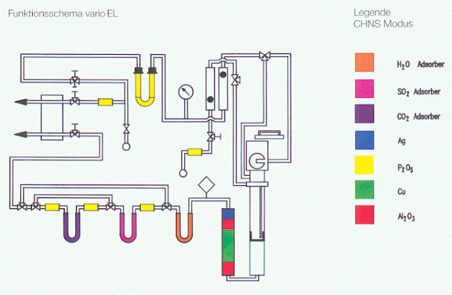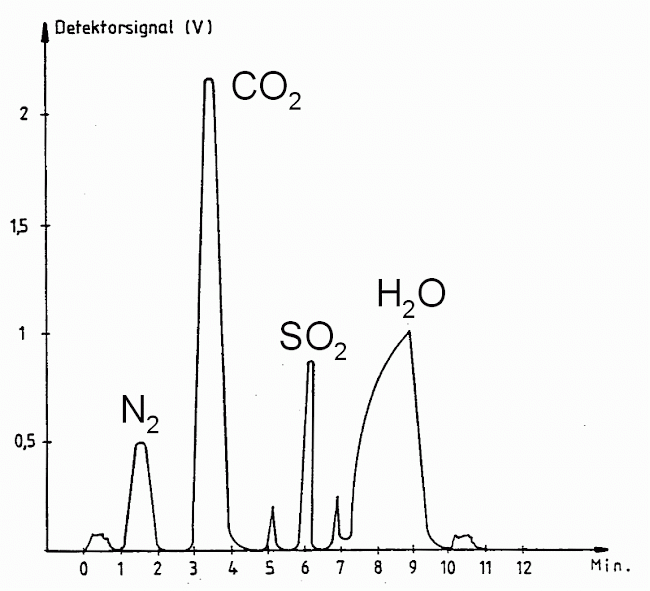 Die Auftrennung der einzelnen Bestandteile des Verbrennungsgases (CO2, H2O, N2 und SO2) erfolgt nach dem gaschromatographischen Prinzip in U-förmigen Trennsäulen, die mit speziellen Adsorptionsmitteln gefüllt sind: