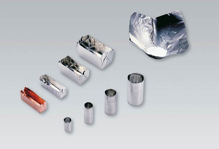 Zinnkapseln zum Einwiegen von Flüssigkeiten und Zinnschiffchen zum Einwiegen von Feststoffen