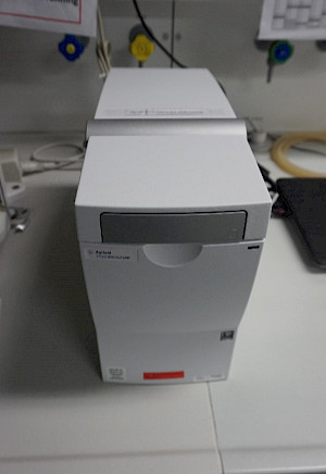 Bioanalyzer With the Agilent 2100 Bioanalyzer automated electrophoresis can be performed. It can be used for sizing, quantitation, and purity assessments for DNA, RNA, and protein samples. The samples are loaded onto a chip and therefore separation time and sample consumption are minimized compared to the rather time consuming “classical” SDS-Page. |