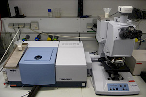 FT-IR Spectrometer Bruker Tensor 27 IR Spectrometer with Hyperion microscope (Bruker Optics) Determination of protein secondary structure by Fourier transform infrared spectroscopy.ATR objective (20x) for the Hyperion microscope combines a visual sample inspection with highest sensitivity of the IR measurement. |