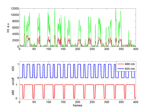 Dronpa is known to exhibit highly reversible photoswitching behaviour with a response time of milliseconds, being switched in a fluorescent state upon illumination with 405 nm and in a non-fluorescent state by 480 nm excitation.