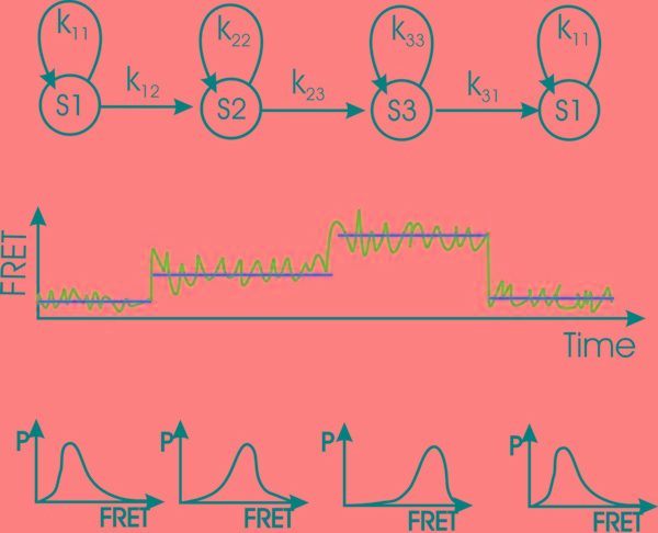 Our aim is to obtain information about the binding pathway based on kinetic information extracted from FRET trajectories.