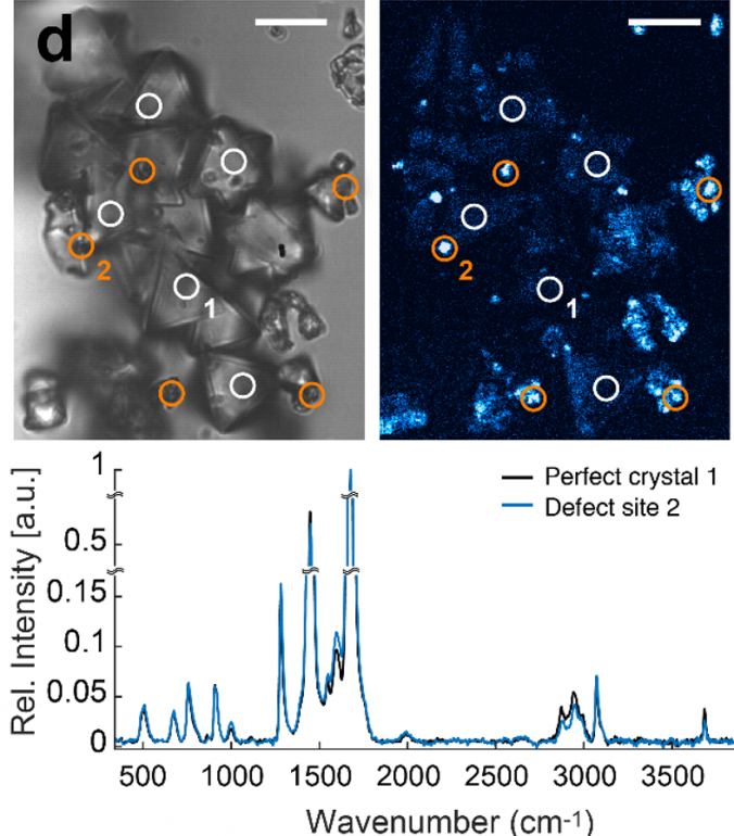 | Water uptake in MOF-801 monitored by correlated CARS microscopy and Raman spectroscopy: localized water clusters are present due to missing cluster defects. |