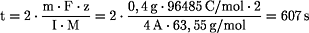 Da die Stromausbeute nur 50% ist, muß die Zeit t zur Abscheidung von Kupfer verdoppelt werden (Faktor 2 vor dem Quotiemten).